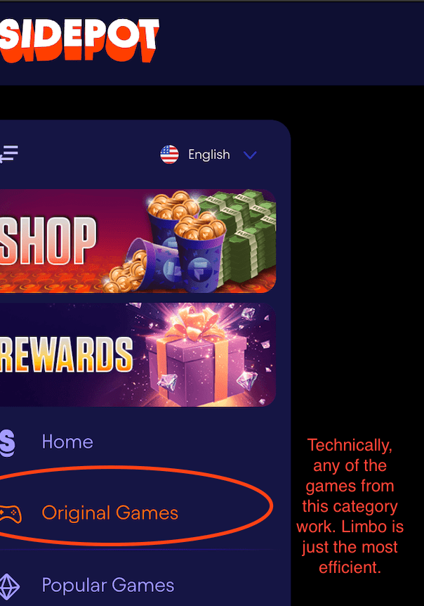 Sidepot.us has a weekly challenge, hit 100x or higher multiplier on any of their “Original Games” and you get 30 free SC spins! The best part is, you can complete this challenge with gold coins! Limbo auto is by far the easiest way to complete it, see my screenshots below. The challenge resets every Sunday.